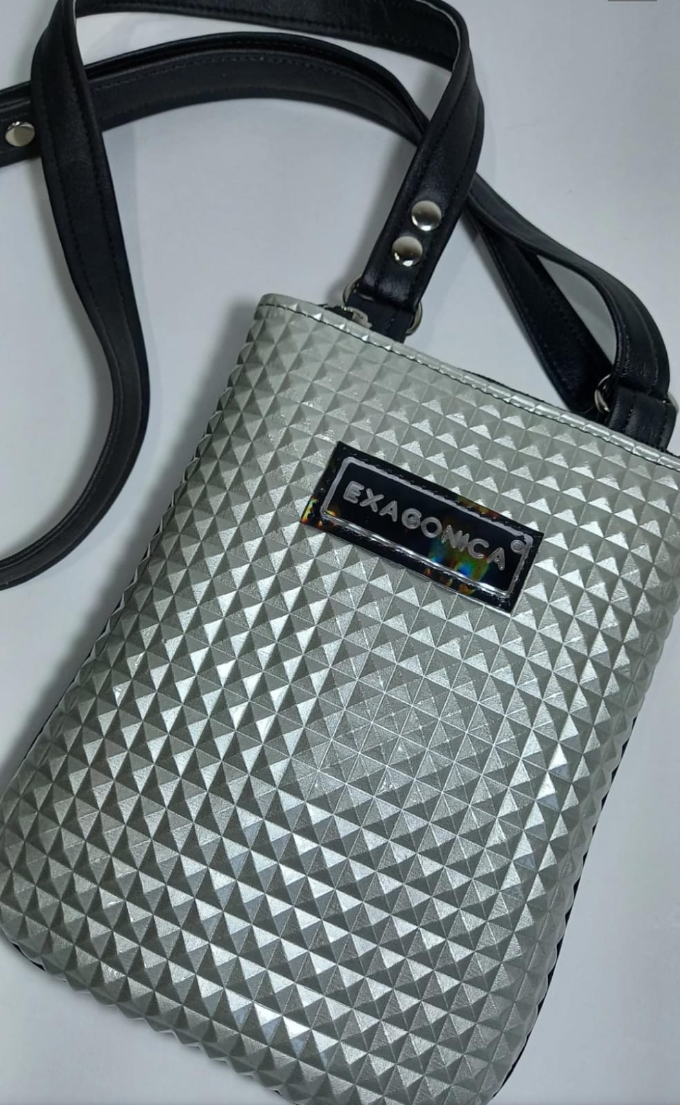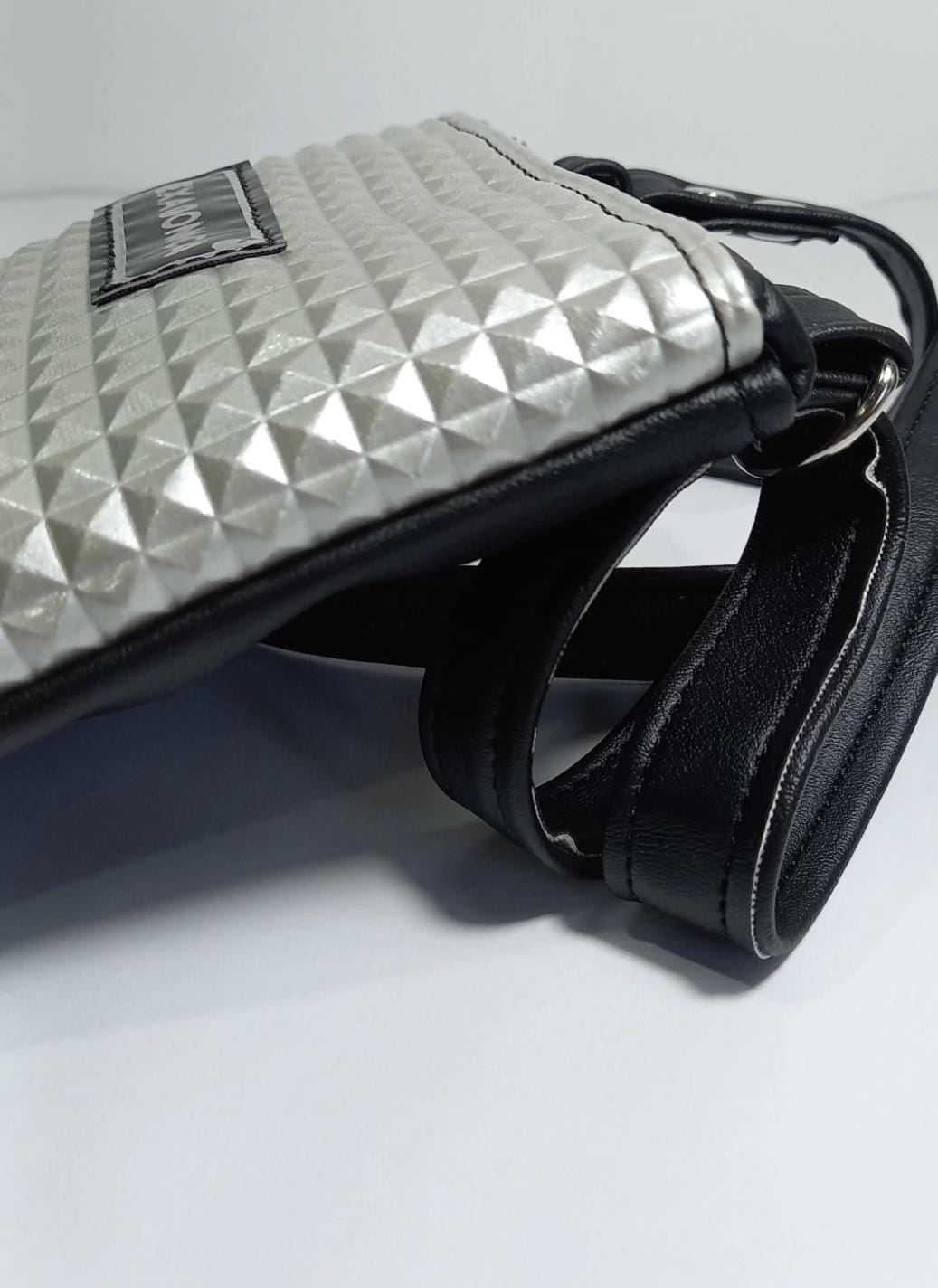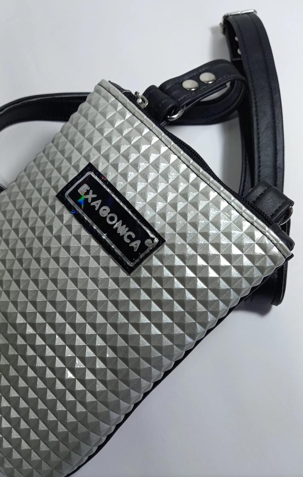 Color: frente plateado de textura piramide charol, combinado con la parte de atras y correa en negro.