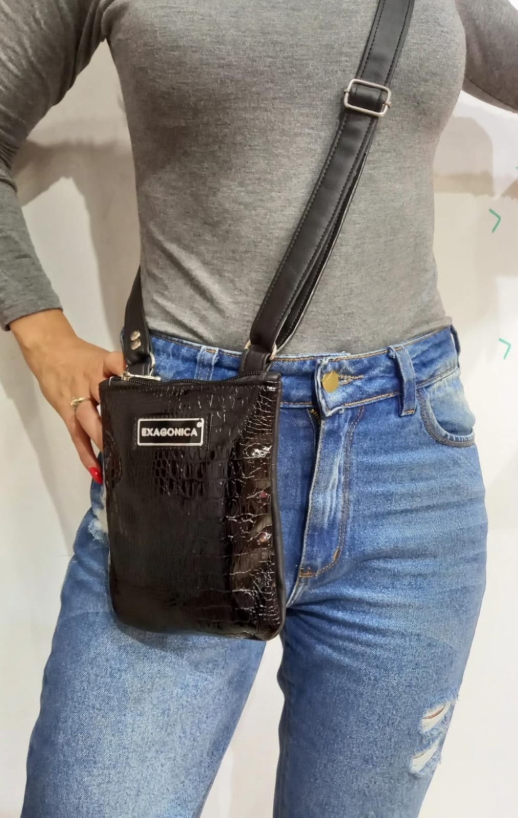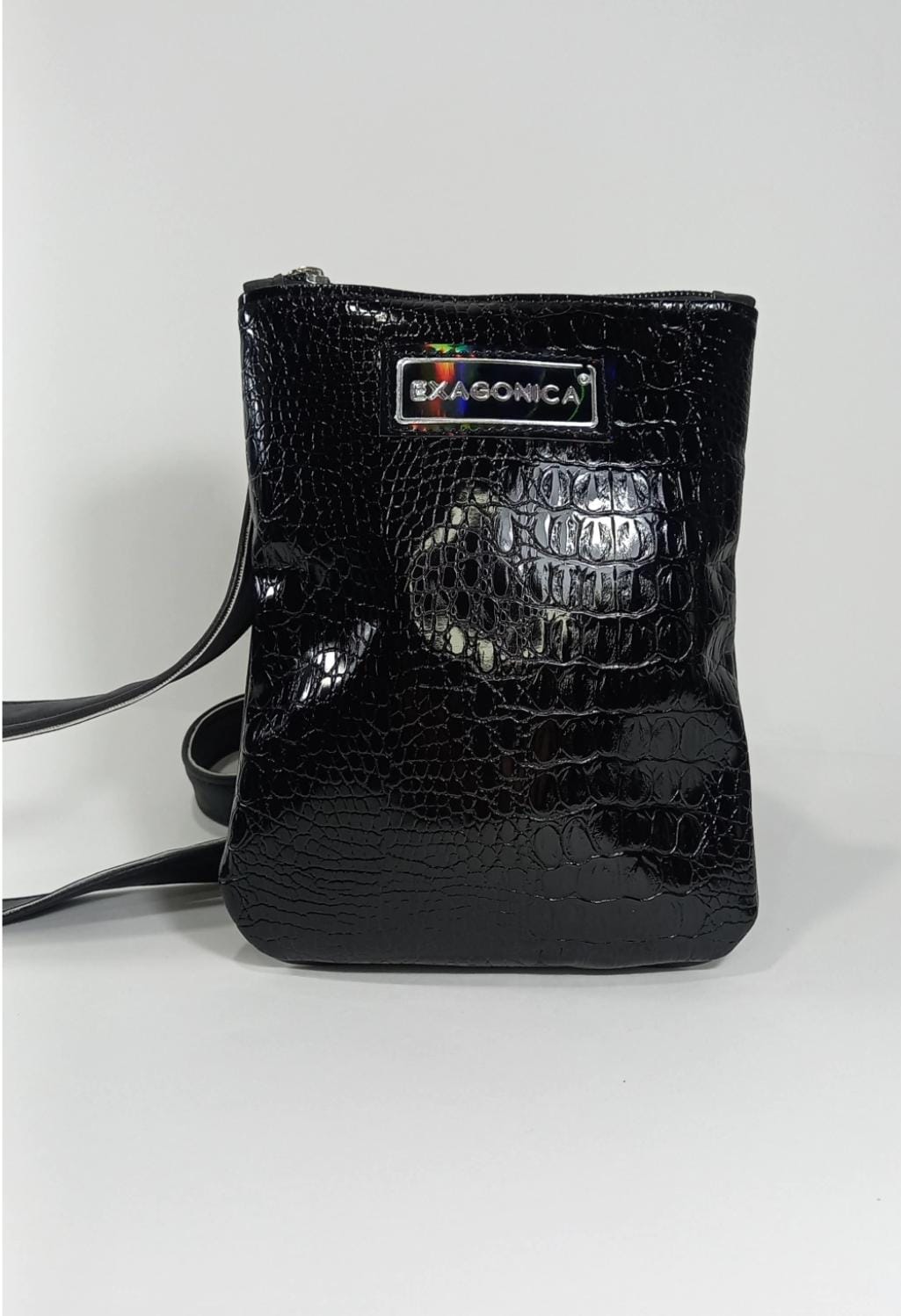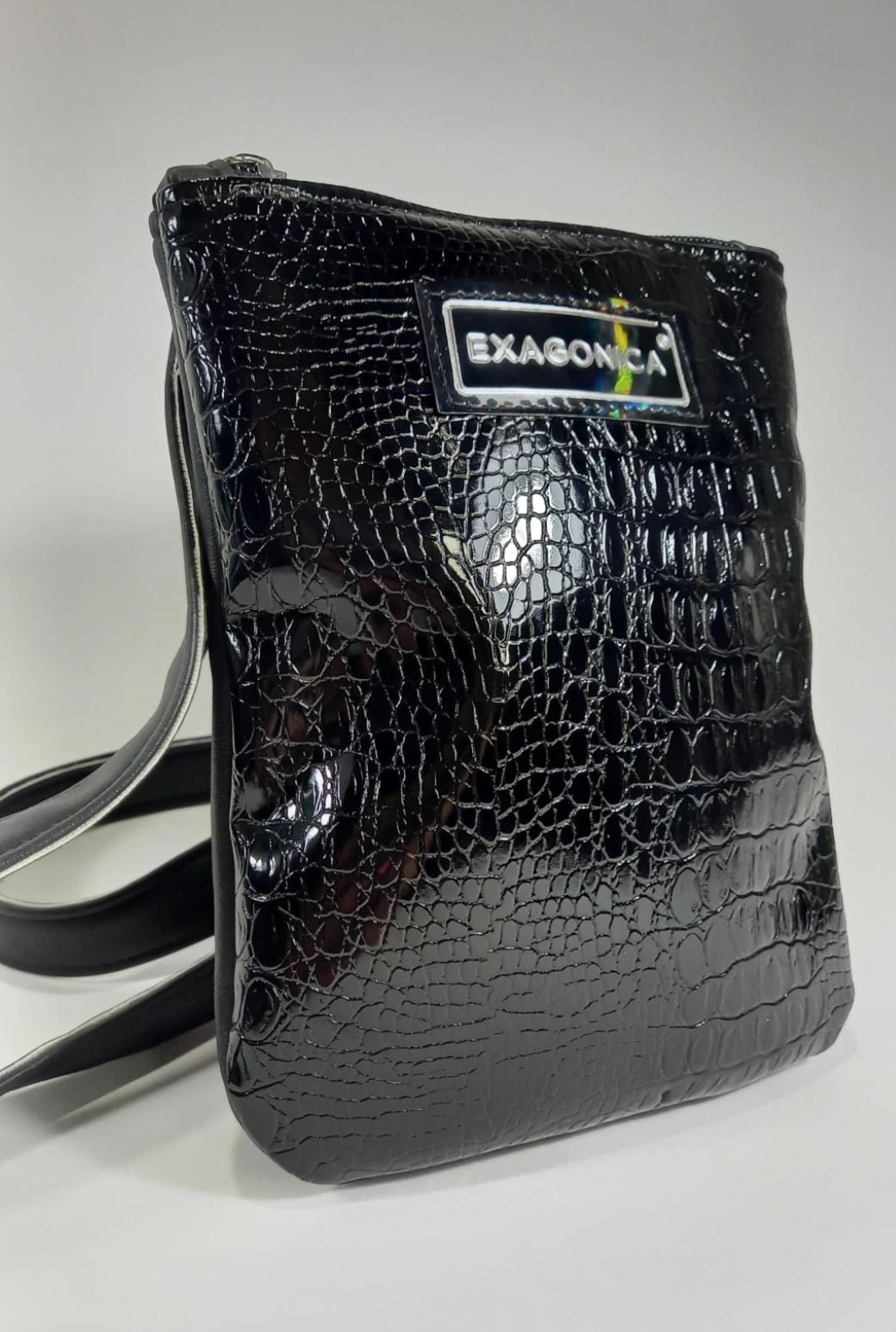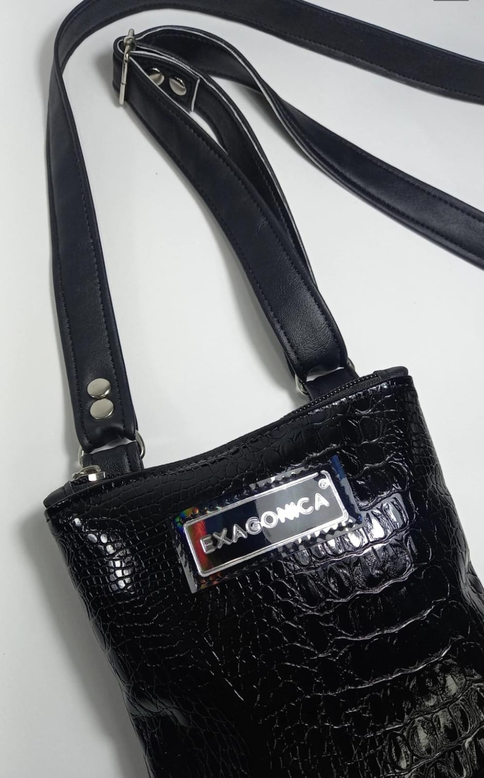 Color: frente plateado de textura piramide charol, combinado con la parte de atras y correa en negro.