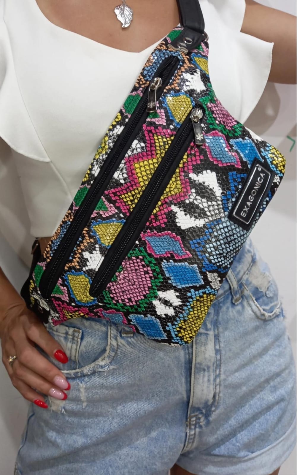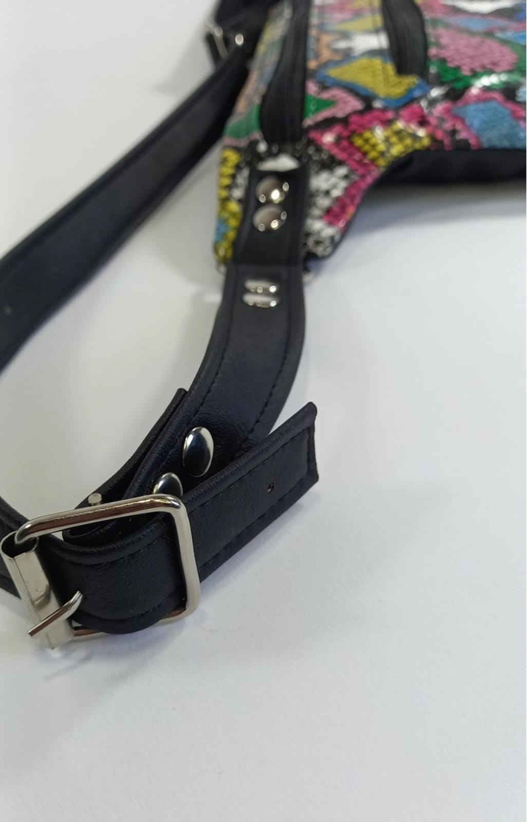 Correa de ecocuero regulable con hebilla y regulador para que puedas elegir el largo para usarla cruzada en el torso, en la cadera o tipo carterita.